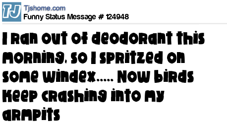 - # 124115 I ran out of deodorant this morning, so I spritzed on some windex. Now birds keep crashing into my armpits :(