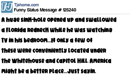 X A huge sink-hole opened up and swallowed a Florida redneck while he was watching TV in his bedroom...If only a few of these were conveniently located under the Whitehouse and Capitol Hill, America might be a better place...Just sayin.