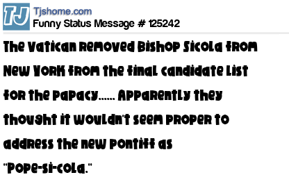 X The Vatican removed Bishop Sicola from New York from the final candidate list for the papacy...... Apparently they thought it wouldn't seem proper to address the new pontiff as ''Pope-si-cola.''