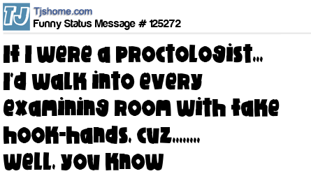 X If I were a proctologist,,, I'd walk into every examining room with fake hook-hands, cuz,,,,,,,, well, you know