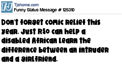 - # 124856 Don't forget Comic Relief this year. Just £5 can help a disabled African learn the difference between an intruder and his f**king girlfriend