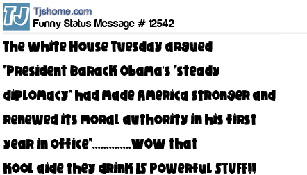 X is The White House Tuesday argued "President Barack Obama's "steady diplomacy" had made America stronger and renewed its moral authority in his first year in office"..............WOW that kool aide they drink IS Powerful STUFF!!