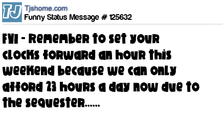 X says FYI - Remember to set your clocks forward an hour this weekend because we can only afford 23 hours a day now due to the sequester......
