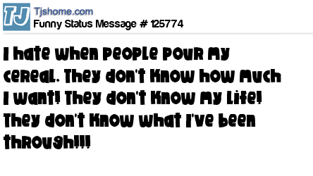 - # 131835 I hate when people pour my cereal. They don't know how much I want. They don't know my life. They don't know what I've been through!