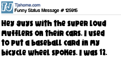 X says Hey guys with the super loud mufflers on their cars. I used to put a baseball card in my bicycle wheel spokes. I was 12.