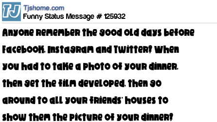 - # 134310 remember before facebook when you would take a picture of your dinner, get it developed and take it to all your friends houses and show them?. Me neither.