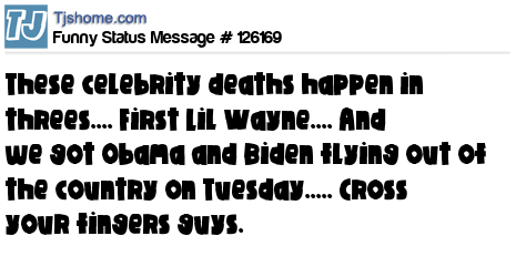 X These celebrity deaths happen in threes.... First Lil Wayne.... And we got Obama and Biden flying out of the country on Tuesday..... Cross your fingers guys.