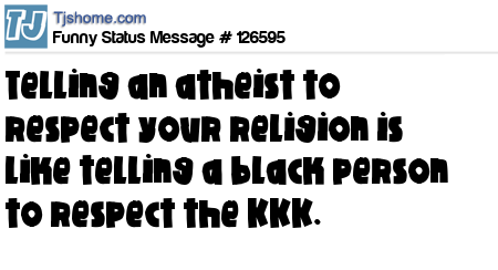 X Telling an atheist to respect your religion is like telling a black person to respect the KKK.