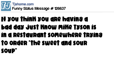- # 207272 If you think your life can't get any worse, just remember this. you could be Mike Tyson in a Chinese restaurant trying to order the Sweet and Sour Shrimp.