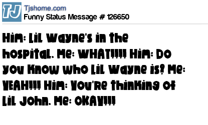 X says Him: Lil Wayne's in the hospital. Me: WHAT!!!! Him: Do you know who Lil Wayne is? Me: YEAH!!! Him: You're thinking of Lil John. Me: OKAY!!!