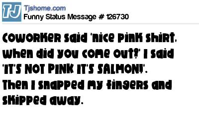 X says Coworker said 'nice pink shirt, when did you come out?' I said 'IT'S NOT PINK IT'S SALMON!'. Then I snapped my fingers and skipped away.