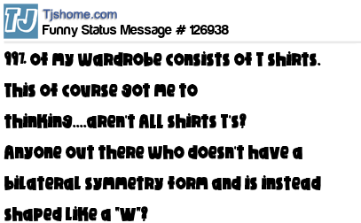 X 99% of my wardrobe consists of T shirts. This of course got me to thinking....aren't ALL shirts T's? Anyone out there who doesn't have a bilateral symmetry form and is instead shaped like a "W"?