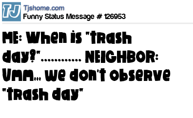 X ME: When is "trash day?"............ NEIGHBOR: Umm,,, we don't observe "trash day"
