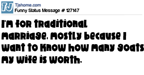X is I'm for traditional marriage, mostly because I want to know how many goats my wife is worth.