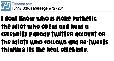 X says I dont know who is more pathetic, the idiot who opens and runs a celebrity parody twitter account or the idiots who follows and re-tweets thinking its the real celebrity.