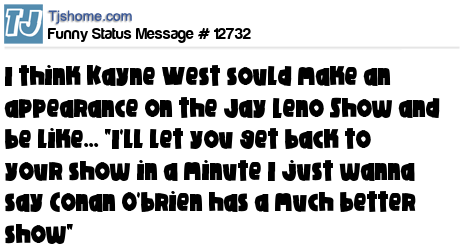 X says I think Kayne West sould make an appearance on the Jay Leno Show and be like... "I'll let you get back to your show in a minute I just wanna say Conan O'brien has a much better show"
