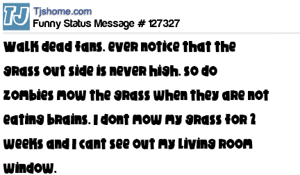 X walk dead fans. ever notice that the grass out side is never high. so do zombies mow the grass when they are not eating brains. I dont mow my grass for 2 weeks and I cant see out my living room window.