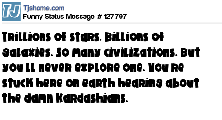 X says Trillions of stars. Billions of galaxies. So many civilizations. But you’ll never explore one. You’re stuck here on earth hearing about the damn Kardashians.