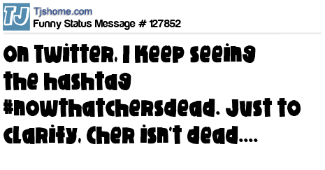 X is On Twitter, I keep seeing the hashtag #nowthatchersdead. Just to clarify, Cher isn't dead....