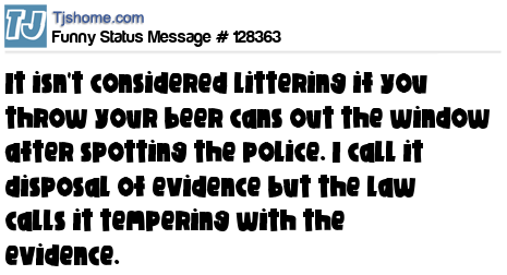 X says It isn't considered littering if you throw your beer cans out the window after spotting the police. I call it disposal of evidence but the law calls it tempering with the evidence.
