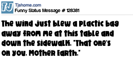 X is The wind just blew a plactic bag away from me at this table and down the sidewalk. "That one's on you, Mother Earth."