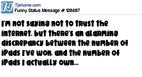 - # 126204 I'm not saying don't trust the internet but there's an alarming discrepancy between the number of ipads I've won & the number of ipads I own