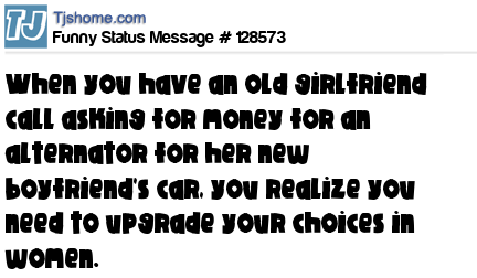 X is When you have an old girlfriend call asking for money for an alternator for her new boyfriend's car, you realize you need to upgrade your choices in women.