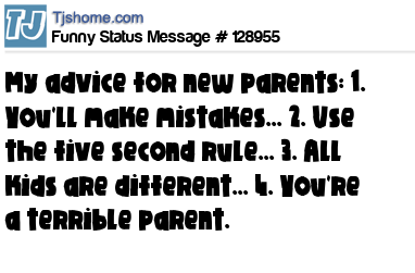 X My advice for new parents: 1. You'll make mistakes... 2. Use the five second rule... 3. All kids are different... 4. You're a terrible parent.