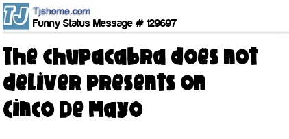 - # 129722 The Chupacabra came down the chimney and left me a PiƱata full of coal ...that means 6 more months of Tequila! Happy Cinco De Mayo