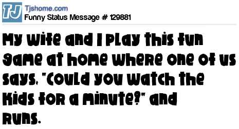 X My wife and I play this fun game at home where one of us says, "Could you watch the kids for a minute?" and runs.