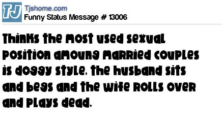 - # 19180 -- The most used sexual position for married couples is the doggie position... The husband sits and begs for it while the wife rolls over and plays dead.