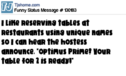 X says I like reserving tables at restaurants using unique names so I can hear the hostess announce, "Optimus Prime? Your table for 2 is ready!"