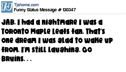 X says JAB, I had a nightmare I was a Toronto Maple Leafs fan. That's one dream I was glad to wake up from, I'm still laughing. Go Bruins. . .
