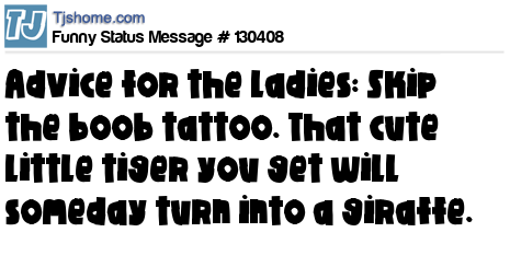 X says Advice for the ladies: Skip the boob tattoo. That cute little tiger you get will someday turn into a giraffe.