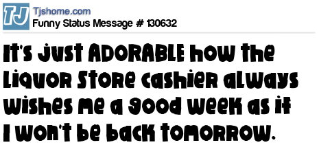 X It's just ADORABLE how the Liquor Store cashier always wishes me a good week as if I won't be back tomorrow.