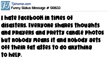 X says I hate Facebook in times of disasters, Everyone shares thoughts and prayers and pretty candle photos but nobody means it and nobody gets off their fat a$$es to do anything to help.