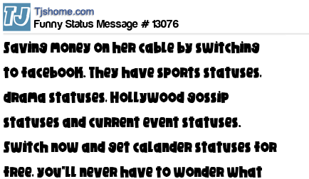X is saving money on her cable by switching to facebook. They have sports statuses, drama statuses, Hollywood gossip statuses and current event statuses. Switch now and get calander statuses for free, you"ll never have to wonder what day it is again.