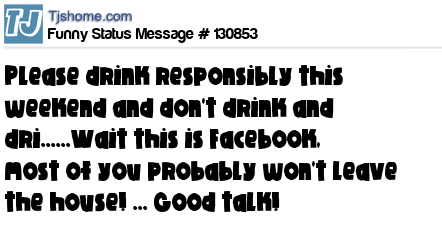 X Please drink responsibly this weekend and don't drink and dri......Wait this is Facebook, most of you probably won't leave the house! ... Good talk!