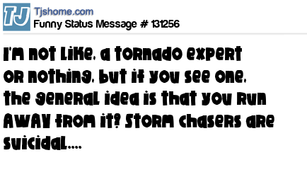 X says I'm not like, a tornado expert or nothing, but if you see one, the general idea is that you run AWAY from it? Storm chasers are suicidal....