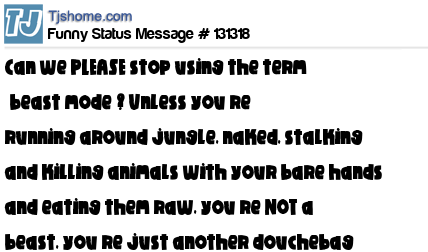 X says can we PLEASE stop using the term “beast mode”? Unless you’re running around jungle, naked, stalking and killing animals with your bare hands and eating them raw, you’re NOT a beast, you’re just another douchebag lifting weights in the gym…tha
