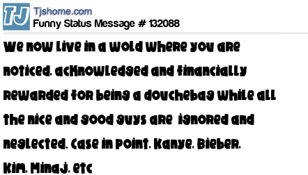 X says We now live in a wold where you are noticed, acknowledged and financially rewarded for being a douchebag while all the nice and good guys are ignored and neglected. Case in point, Kanye, Bieber, Kim, Minaj, etc