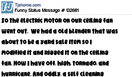 X says So the electric motor on our ceiling fan went out. We had a old blender that was about to be a yard sale item so I modified it and rigged it on the ceiling fan. Now I have off, high, tornado, and hurricane. And oddly, a self cleaning house now.....