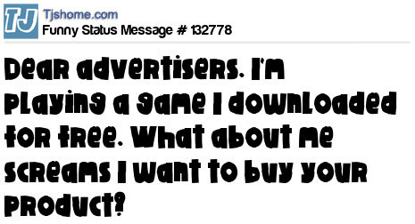 - # 143021 Ok advertisers, for the last time. I’m playing a game I downloaded for free. So, the fact that you chose to advertise here means your product is grossly overpriced…