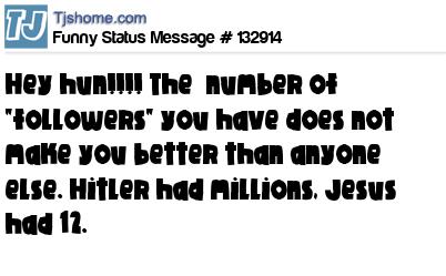 - # 121698 The number of "followers" you have does not make you better than anyone else. Hitler had millions, Jesus had 12.
