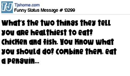 X says What's the two things they tell you are healthiest to eat? Chicken and fish. You know what you should do? Combine them, eat a penguin...