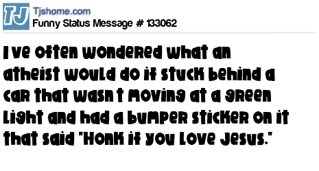 - # 202849 I’ve often wondered what an atheist would do if he was stuck behind a car that wasn’t moving at a green light and had a bumper sticker on it that said "Honk if you love Jesus."