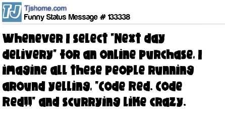 X Whenever I select "Next day delivery" for an online purchase, I imagine all these people running around yelling, "Code Red. Code Red!!" and scurrying like crazy.