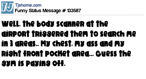 X says Well, the body scanner at the airport triggered them to search me in 3 areas.. My chest, my ass and my right front pocket area... Guess the gym is paying off.