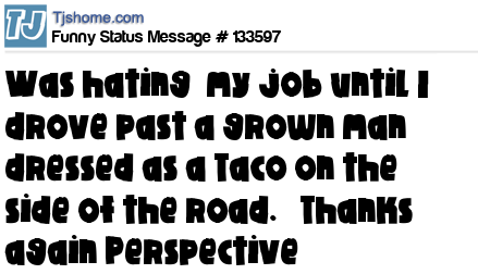 - # 143253 Was hating my job until I drove past a grown man dressed as a Taco on the side of the road. Thanks again Perspective