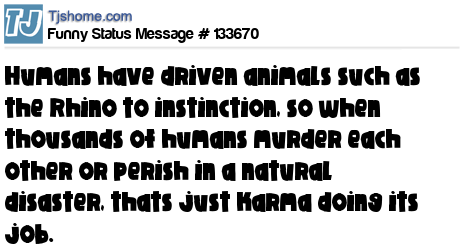 X says Humans have driven animals such as the Rhino to instinction, so when thousands of humans murder each other or perish in a natural disaster, thats just karma doing its job.